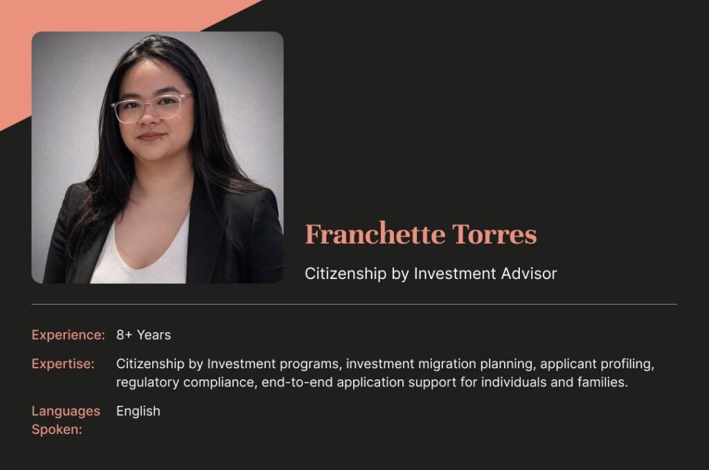 Known for her structured, compliance-focused approach, she ensures applications meet program requirements from the outset. Her ability to simplify complex processes and provide clear guidance has helped many clients move forward with confidence in their citizenship and residency decisions.
