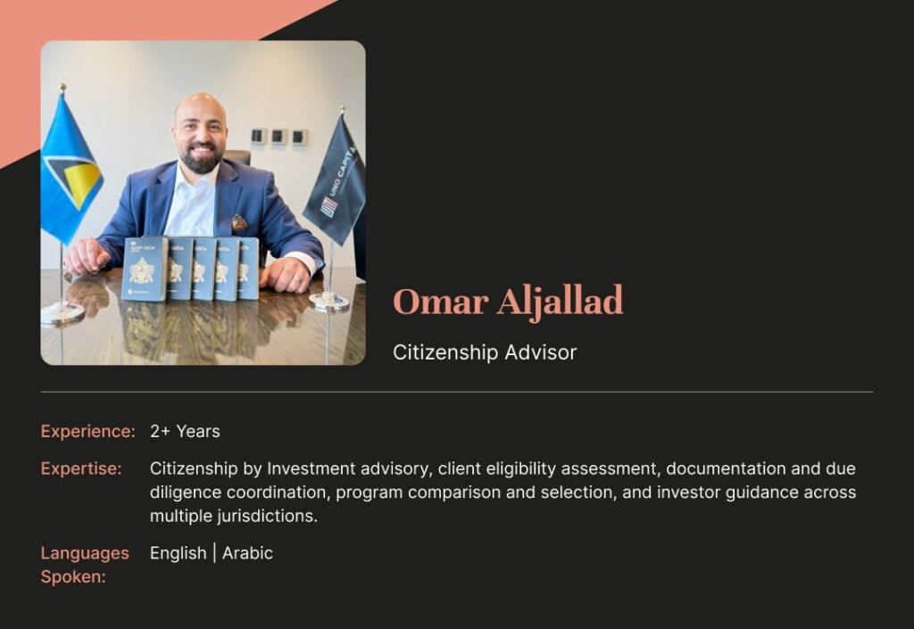 Omar Aljallad is a dedicated citizenship advisor with 2 years of experience assisting individuals and families in navigating Citizenship by Investment programs.